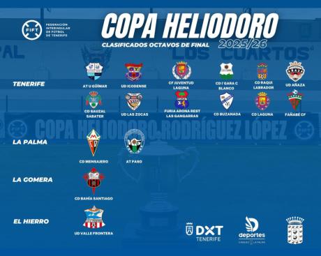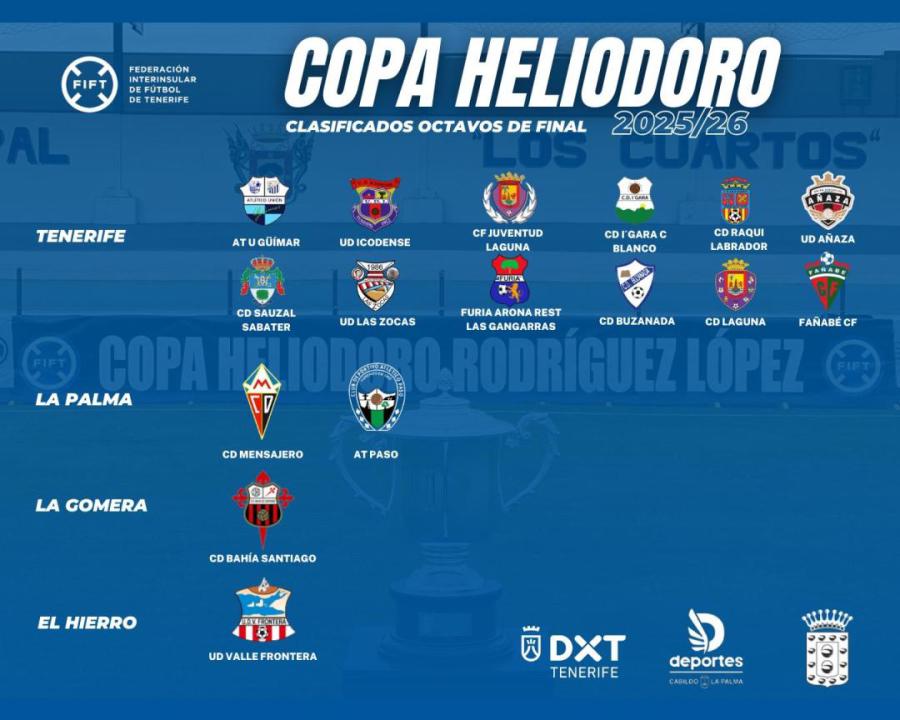 La Copa Heliodoro 2025-26 ya conoce a todos los equipos que han logrado su billete para la tercera fase. 16 equipos de Tenerife, La Palma, La Gomera y El Hierro formarán parte del sorteo de octavos de final, que se celebrará este próximo miércoles 7 de enero, a partir de las 12:00 horas, en la sede de Santa Cruz de Tenerife de la Federación Interinsular de Fútbol de Tenerife (FIFT).